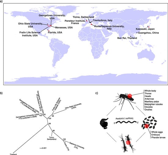 3.4. AealbAV Is Distributed Worldwide in Ae. albopictus Laboratory Colonies and Wild Populations