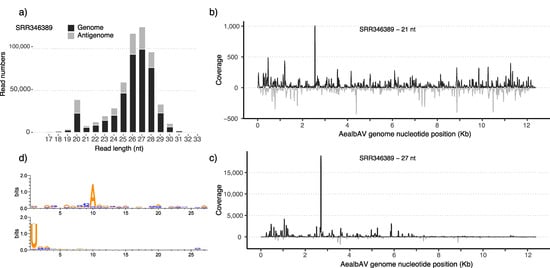 Interestingly, we identified reads from miRNA sequencing datasets mapping to AealbAV genome (Table 1, Table S1). AealbAV miRNA reads were identified in samples of Ae. albopictus experimentally infected with CHIKV (SRR346385-SRR346389) []. Mapping miRNA reads covered 90 to 100% of AealbAV genome in these samples (Table S1). We also identified AealbAV miRNAs in Ae. albopictus pharate larvae (embryonated eggs) libraries from the Georgetown University (SRR5168326-SRR5168333) [] (coverage: 1.1 to 2.5×; breadth of coverage: 52.7 to 74%). It is important to notice that we identified AealbAV sequences from both miRNA and RNA-seq data generated from this colony. We also found high levels (depth of coverage: 49.8×; breadth of coverage: 99%) of miRNAs mapping to AealbAV in a recently published dataset (SRR11213090) of Ae. albopictus experimentally infected with three distinct ISVs, namely, Aedes flavivirus, Menghai rhabdovirus and Shinobi tetravirus []. Overall, these data suggested that AealbAV may interact with the Ae. albopictus RNAi pathway. Therefore, we further investigated the possible mosquito RNAi response against AealbAV by analyzing the composition of the miRNA reads mapping to AealbAV using the published datasets of Ae. albopictus experimentally infected with CHIKV (SRR346385-SRR346389) []. For each library, adapter-trimmed reads were mapped against the AealbAV genome. AealbAV-derived miRNA reads ranged from 0.34% (library SRR346385) to 2.0% (library SRR346389) of the total sequenced clean reads. Figure 4 reports reads for library SRR346389 mapping to both the genome and the anti-genome of AealbAV (Figure 4a). Mapping profiles for the other libraries are reported in Figure S1. Mapping reads showed a length distribution with typical peaks at 21 nt and 27/28 nt likely corresponding to viral small interfering RNAs (vsiRNAs) and vpiRNAs respectively. Mapping reads of 21 and 27 nt were extracted and re-mapped to the genome. The 21-nt fraction of vsiRNAs targeted both the genome and anti-genome of AealbAV with a slight bias toward the genomic strand (Figure 4b). The 21-nt peak and the coverage along all AealbAV genome on both senses indicates that these AealbAV-derived siRNAs are likely produced by Dicer−2-mediated cleavage of the dsRNAs produced during virus replication.