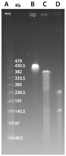 - Barton, B.M.; Harding, G.P.; Zuccarelli, A.J. A general method for detecting and sizing large plasmids. Anal. Biochem. 1995, 226, 235–240. [Google Scholar] [CrossRef]
