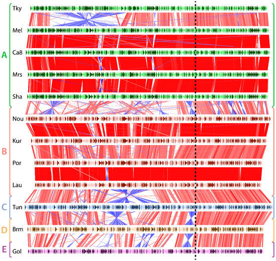 Genomic rearrangements in marseilleviruses. Each horizontal line represents a viral genome, namely: tokyovirus (Tky), melbournevirus (Mel), cannes 8 virus (Ca8), marseillevirus (Mrs), marseillevirus shanghai (Sha), noumeavirus (Nou), kurlavirus (Kur), port-miou virus (Por), lausannevirus (Lau), tunisvirus (Tun), brazilian marseillevirus (Brm) and golden marseillevirus (Gol), grouped and color-coded according to the clade it belongs to (shown on le left). Genes encoded on the forward strain are shown in dark colors and genes on the reverse strand in light colors. Vertical red and blue lines represent homologous genes between a pair of genomes. Red lines correspond to genes that are in the same direction, while blue lines represent inverted genes. The dashed vertical line separates the region prone to genomic rearrangements (on the left) from the one relatively depleted in rearrangements (on the right).
