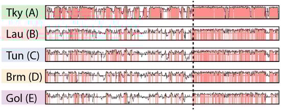 Nucleotide sequence conservation in marseilleviruses. Each row represents the nucleotide sequence identity from the glocal alignment of a Marseilleviridae against the marseillevirus reference. Regions with a sequence identity above 75% are highlighted in red. The following Marseilleviridae were used: tokyovirus (Tky), lausannevirus (Lau), Tunisvirus (Tun), Brazilian marseillevirus (Brm) and golden marseillevirus (Gol). The letters in parenthesis represent the clades the Marseilleviridae belong to. The dashed line separates the most conserved region from the most divergent one.
