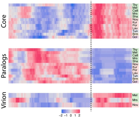 Density of core genes, paralogs and virion-associated protein-coding genes in marseilleviruses. Each row corresponds to a marseillevirus, namely: tokyovirus (Tky), melbournevirus (Mel), cannes 8 virus (Ca8), marseillevirus (Mrs), marseillevirus shanghai (Sha), noumeavirus (Nou), kurlavirus (Kur), port-miou virus (Por), lausannevirus (Lau), tunisvirus (Tun), brazilian marseillevirus (Brm) and golden marseillevirus (Gol). Strains are color-coded according to the clade they belong to, with A in green, B in red, C in blue, D in orange an E in purple. The z-score normalized density is color-coded from blue (low density) to pink (high density). The dash line separates the region of higher density in core genes, paralogs and virion-associated protein-coding genes.