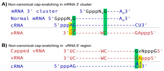 Li and Hui et al. recently reported that IAV utilizes non-canonical cap-snatching to diversify its mRNAs and ncRNAs [5]. Canonical IAV mRNA synthesis starts using the basepairing of the last nt (usually G) of snatched capped small RNAs and the penultimate (-2) nt (always C) of template vRNAs via cap-snatching (Figure 1B). However, non-canonical cap-snatching occurs primarily in two types of regions. In the first type, named as mRNA 3′ clusters, IAV mRNA synthesis utilizes the basepairing of the last nt (G) of snatched capped small RNAs and an internal C nt on template vRNAs, generating mRNAs or ncRNAs usually covering the last ~300 (up to 1000) nts of normal IAV mRNAs (Figure 2A). In the second type, named as vRNA 5′ regions (Figure 2B), cap-snatching primarily occurs at the second position of IAV vRNA, i.e., using the basepairing of the last nt (G) of snatched capped small RNAs and the -2 nt (C) of template cRNAs to synthesize capped vRNAs (normal vRNAs contain a 5′ triphosphate group and start at the first position, which corresponds to -1 nt of template cRNA). This constitutes a perfect symmetric transcription pattern in which IAV mRNAs primarily start using the template vRNA -2 nt and non-capped cRNAs usually utilize the −1 nt, while capped vRNAs start using the template cRNA -2 nt and non-capped vRNAs predominantly utilize -1 (Figure 2A,B). However, the transcription (capped RNA)/replication (non-capped RNA) activities are different since IAV mRNAs (capped) are expressed at much higher levels than non-capped cRNAs, while the opposite, i.e., much more non-capped RNAs, occurs on vRNA strands. Regardless, like canonical cap-snatching, non-canonical cap-snatching also generates host-tagged (a few amino acids) IAV proteins, host-tagged novel proteins, and many ncRNAs. Although most IAV mRNAs (~98%) are generated using the canonical initiation sites (-2 C of template vRNAs), ~9% NA mRNAs utilize the non-canonical sites (mRNA 3′ cluster). Since NA protein plays critical roles in defining the antigenicity of IAV and is used as the major drug target, it is tempting to assume that these non-canonical cap-snatching events could lead to novel NA proteins, which may contribute to IAV virulence, initiate host immune response and affect drug efficacy.