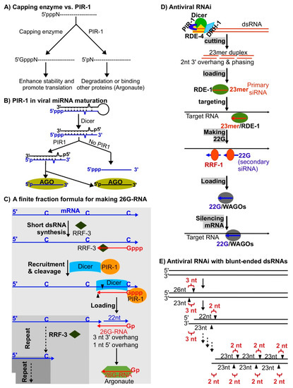 - Lu, R.; Yigit, E.; Li, W.X.; Ding, S.W. An RIG-I-Like RNA helicase mediates antiviral RNAi downstream of viral siRNA biogenesis in Caenorhabditis elegans. PLoS Pathog. 2009, 5, e1000286. [Google Scholar] [CrossRef] [PubMed]