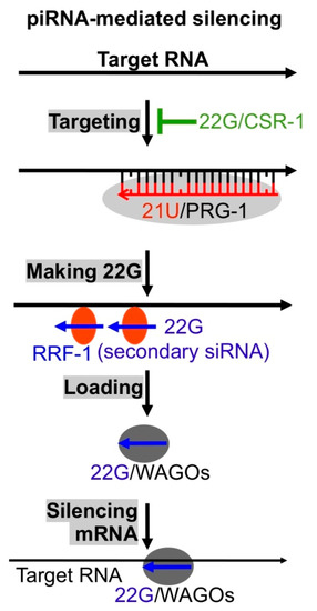 - Gent, J.I.; Lamm, A.T.; Pavelec, D.M.; Maniar, J.M.; Parameswaran, P.; Tao, L.; Kennedy, S.; Fire, A.Z. Distinct phases of siRNA synthesis in an endogenous RNAi pathway in C. elegans soma. Mol. Cell 2010, 37, 679–689. [Google Scholar] [CrossRef]
