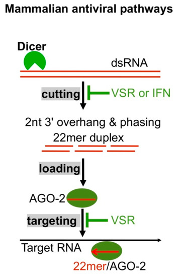 - Seo, G.J.; Kincaid, R.P.; Phanaksri, T.; Burke, J.M.; Pare, J.M.; Cox, J.E.; Hsiang, T.Y.; Krug, R.M.; Sullivan, C.S. Reciprocal Inhibition between Intracellular Antiviral Signaling and the RNAi Machinery in Mammalian Cells. Cell Host Microbe 2013, 14, 435–445. [Google Scholar] [CrossRef]