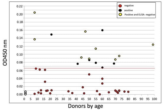 The individual cell-ELISA values obtained from donors and presented as a function of age are shown in Figure 1, 16 samples out of 45 were positive (above the cutoff OD450 of 0.065, red line), with values ranging from 0.067 to 0.22, while 29 samples were negative at OD values < 0.065 (red dots), including PBMCs cryoconserved in 2017 (N = 4, empty dots). Notably, when individuals were concomitantly tested with cell-ELISA and ELISA (ELISA-2), among the 16 subjects tested positive by cell-ELISA, seven were also ELISA positive (43.7%, black dots), and nine tested negative (56.2%; yellow dots). Among the latter, likely considered as individuals who have encountered the virus, despite the negative serological results given by ELISA, two were children (<18 years), four were adults (18–55 years), and three were older (>55 years).