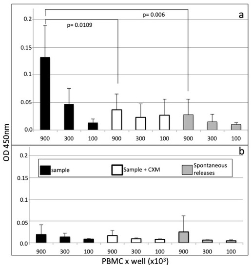 To confirm effective IgG production by B cells, in vitro cultures of PBMC were also evaluated in the presence of CXM, an antibiotic drug known to block initial phases of protein elongation in ribosomes, which have already been employed in a cell-ELISA animal model [5]. The data reported in Figure 2 suggest effective inhibition of protein synthesis and secretion by CXM and likely the blocking of IgG production by plasma cells. The same data also suggest the need to use a minimum concentration of 9 × 106/mL PBMCs to gain reliable cell-ELISA data.