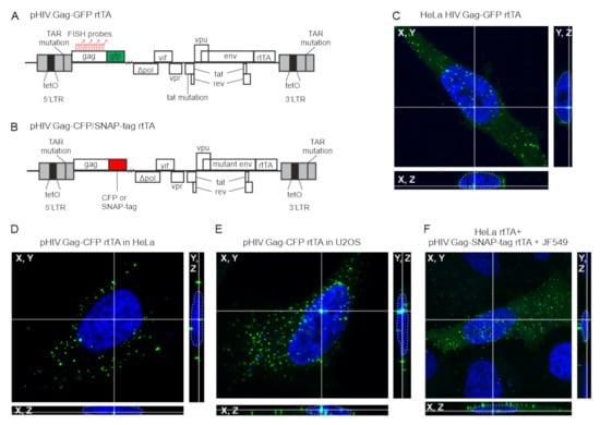 Previous studies have shown that HIV-1 Gag is present in the nucleus [,]. To determine whether HIV-1 Gag trafficked to the nucleus regardless of cell type or fusion tag, we examined HeLa HIV.Gag-GFP rtTA cells [,], a HeLa cell line expressing a stably integrated, dox-inducible HIV-1 provirus encoding a Gag-GFP fusion protein (Figure 1A). Following induction, Gag foci were observed in nucleus, cytoplasm and at the plasma membrane (Figure 1A,C). To determine whether the same Gag localization was seen with transient transfection, HeLa, U2OS, or Hela rtTA cells were transfected with dox-inducible proviral constructs expressing either Gag-CFP or Gag-SNAP-tag fusion (pHIV.Gag-CFP rtTA and pHIV.Gag-SNAP-tag rtTA, respectively; Figure 1B,D–F). pHIV.Gag-CFP rtTA was modified from a plasmid kindly provided by Nathaniel Sherer []. This plasmid was transiently co-transfected with pPB-t-rtTA into HeLa and U2OS cells, and Gag-CFP foci were observed in nucleus, cytoplasm, and plasma membrane (Figure 1D,E). To ensure that HIV-1 Gag nuclear localization was not a phenomenon related to the GFP or CFP tags, we fused the SNAP-tag to the C terminus of Gag, which provides single molecule resolution of proteins when cells are incubated with JF549 SNAP-tag ligand []. HeLa rtTA cells transfected with pHIV.Gag-SNAP-tag rtTA JF549 demonstrated a very similar distribution of Gag foci in the nucleus, cytoplasm, and plasma membrane (Figure 1F) when compared to the HeLa HIV.Gag-GFP rtTA cell line.