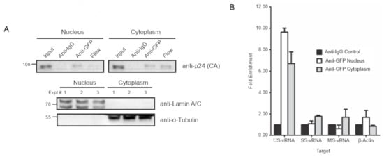 Mouse anti-GFP (Roche, MilliporeSigma, Cat.11814460001) or control Mouse IgG (Jackson ImmunoResearch, West Grove, PA, USA, Cat.015-000-003) were pre-ligated to magnetic bead suspension (Bio-Rad Sure Beads Protein G, 10 µg/µL ≥ 6 µg/mg binding capacity, BioRad). Beads were washed in three times in 3× sterile filtered PBS-T (0.1% Tween-20) then incubated by rotating overnight at 4 °C with the appropriate cytoplasmic or nuclear fractions. IP complexes were isolated by magnetic separator and the supernatants reserved for downstream analysis. Beads were washed with nuclear extraction buffer and transferred to a new tube followed by an additional nuclear extraction buffer wash and two washes with lysis buffer. IP suspensions were separated into two equal volumes then resuspended in cytoplasmic lysis buffer for immunoblot analysis and TRIzol reagent (Invitrogen Cat. 15596026) for RNA analysis. Harvested RNA was resuspended in water and an aliquot was reverse transcribed to cDNA with M-MLV Reverse Transcriptase (Thermo Fisher Scientific-Invitrogen Cat. 28025013). Diluted cDNAs were used to quantitate RNA targets: US (forward 5′-CTG AAG CGC GCA CGG CAA -3′, reverse 5′-GAC GCT CTC GCA CCC ATC TC-3′), SS (forward 5′-GGC GGC GAC TGG AAG AAG C-3′, reverse 5′-CTA TGA TTA CTA TGG ACC ACA C-3′), MS (forward 5′-GAC TCA TCA AGT TTC TCT ATC AAA-3′, reverse 5′-AGT CTC TCA AGC GGT GGT-3′), and β-actin (forward 5′-GAG CGG TTC CGC TGC CCT GAG GCA CTC-3′, reverse 5′-GGG CAG TGA TCT CCT TCT GCA TCC TG-3′) as previously described []. Fold enrichments over 10% input control were calculated using the 2−∆∆Ct method []. Lysate and IP samples were eluted in boiling dissociation buffer (250 mM Tris-HCL pH6.8, 5% SDS, 50% glycerol, 0.1% bromophenol blue, and 5% β-mercaptoethanol) and supernatants were run on an SDS-PAGE gel. The gel was transferred onto PVDF and immunoblotted with mouse anti-p24 HIV-1 Gag hybridoma 183 (NIH AIDS Reagent Program, Division of AIDS, NIAID, NIH, Germantown, MD, USA). Blots of nuclear and cytoplasmic lysates were incubated with mouse anti-Lamin A/C (BD Transduction Laboratories, Cat. 612162), and mouse anti-α-Tubulin ((MilliporeSigma, Cat. T9026). All blots were incubated with anti-mouse secondary immunoglobulin G conjugated to horseradish peroxidase (Jackson ImmunoResearch, Cat. 711-036-152) and detected using chemiluminescence.