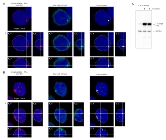 The HIV constructs in the experiments up to this point were expressed using doxycycline-inducible promoters, therefore we examined whether the results could be confirmed in a more biologically relevant cell type in which the native viral 5′UTR was intact. To this end, we used JLat 10.6 cells, which are Jurkat-derived T cells infected with a full-length HIV-1 genome that contains gfp in place of nef and a frameshift in the env gene []. JLat 10.6 cells were previously thought to contain a single integration site [], although more recently were shown to have two proviral integration sites, one of which may be incomplete or defective []. The HIV-1 provirus is latent in these cells and can be reactivated using a variety of drugs []. In Figure 8, JLat 10.6 cells were treated with prostratin, which induces expression through the NF-κB pathway [,,]. Confocal z-stacks were obtained in which HIV-1 USvRNA was labeled using smFISH and Gag was detected by immunofluorescence. HIV-1 USvRNA (red) co-localized with Gag (green) in the nucleus (DAPI; outlined in white) in a large focus that likely represents a burst of transcription occurring at the proviral integration site (Figure 8A, panel i), as shown previously []. The lower panel (Figure 8B, panel i) depicts a different cell showing Gag co-localization with USvRNA at two large transcription sites, as well as several additional smaller vRNP complexes throughout the nucleoplasm with accumulation near the nuclear periphery, similar to USvRNA imaged in HIV-1 infected cells []. To demonstrate that these foci were contained within the nucleus, a three-dimensional reconstruction (Figure 8A,B, panel ii) was performed, showing that the complexes were located within the DAPI signal in all three aspects. A co-localization algorithm was used to identify Gag-USvRNA complexes (white), highlighting larger vRNPs as well as the smaller co-localized complexes within the nucleus.