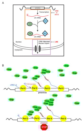 In the current report, we have dissected the Gag-USvRNA nuclear interaction in more detail, demonstrating that HIV-1 vRNP formation is enhanced with transcriptional inhibition, suggesting that Gag accumulates at stalled viral transcription sites. Based on these results, we propose a novel model for the initial interaction of HIV-1 Gag with genomic RNA, as depicted in Figure 9. As nascent viral RNAs are transcribed at the proviral integration site, the 5′ end containing the psi packaging sequence would emerge first, and once it adopts the proper three-dimensional conformation, it would be available for Gag binding. Shutting off transcription during elongation with Act D or DRB would lead to an accumulation of vRNA with intact 5′ ends, allowing Gag to bind to psi, manifesting as an increase in co-localization in our imaging studies. This finding suggests that nascent HIV-1 RNPs are stabilized under these conditions. In contrast to this result, interfering with transcriptional elongation reduces Rev binding to viral RNA [,] possibly because transcription is halted prior to synthesis of the RRE at the 3′ end of the genome. Future studies comparing these observations with deletions in psi and mutations in Gag that affect vRNA binding will be needed to further examine the cis and trans-acting elements required for the interaction of Gag with USvRNA in the nucleus.