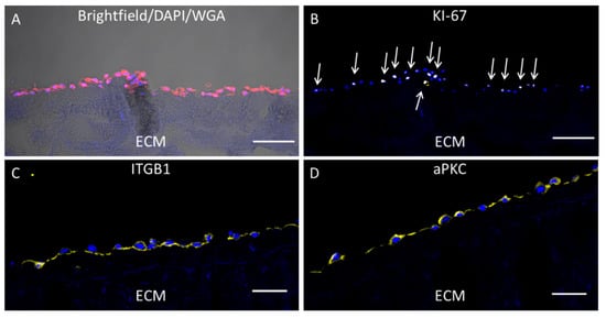 Cultivation of primary human keratinocytes (NHEK) on decellularized extracellular matrix (ECM). The 8 µm sections of ECM were analyzed by microscopy. NHEK grown on decellularized ECM for 2 days were treated with CF594 (red) coupled wheat germ agglutinin (WGA) for staining of sialic acid. N-acetylglucosamin on cell membranes and ECM structure was visualized with a brightfield channel (A). After permeabilization, KI-67 (B) as a proliferation marker (proliferative cells indicated by arrows), integrin beta 1 (ITGB1) as basal polarization marker (C) and the atypical protein kinase C (aPKC) as apical polarization marker (D) were visualized with polyclonal antibodies and AF647 (yellow) coupled anti-rabbit secondary antibodies. Cellular nuclei were counterstained with DAPI (blue). Scale bar = 100 µm.
