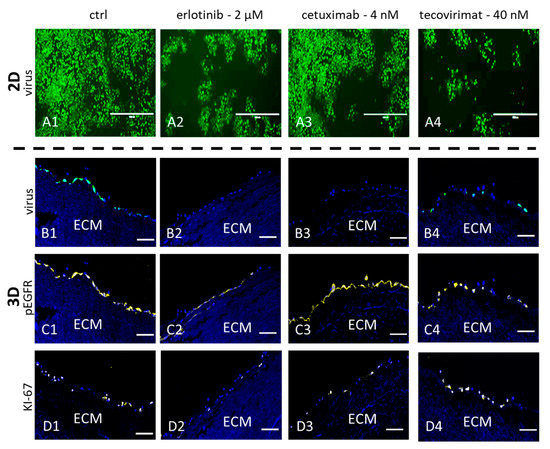 Billions of dollars are invested in clinical studies each year for the investigation of novel therapeutic substances, among them antiviral therapeutics against a broad range of different viruses [1,2]. Most of these studies are designed based on preliminary research data from in vitro cell culture studies in monolayer cultures where cells grow in a rather artificial way attached to an artificial plastic surface and with reduced cell–cell contact compared to the in vivo situation [3]. Upstream of the clinical studies, in vitro results are verified in animal models which as living organisms on the one hand represent a more complex system than monolayer cultures. On the other hand, animal models are non-human systems in which the cells may react differently to stimuli and may interact with each other in ways different from cells in humans [4]. In the last few years, several promising alternatives to these preclinical stages have been developed among them different three-dimensional (3D) cultivation methods with human cells [5]. Such cultures represent a more in vivo-like model than standard monolayer cultures. They are also superior to animal models in other aspects regarding their human origin. While the complexity of in vivo models can hardly be imitated and replaced by 3D cultures in the near future, they may be able to display a human-specific cellular response to treatment with different substances [6,7]. Therefore, it is more likely that new physiologically relevant targets for antiviral strategies will be identified using 3D cultures instead of standard monolayers. In this context several studies have been published which show a differential efficacy of compounds tested against virus infections in 3D-cultivated cells [8,9,10,11]. We have shown previously that the antiviral efficacy of the anti-tumor drug gefitinib against Cowpox virus (CPXV) infections is strongly enhanced in 3D cultures of primary normal human epithelial keratinocytes (NHEK) compared to the respective monolayer cultures. Gefitinib intracellularly targets the human epidermal growth factor receptor (EGFR) and thus inhibits EGFR-dependent signaling via viral homologs of the epidermal growth factor (EGF), which is essential for poxvirus replication [10]. For example, Vaccinia virus (VACV), which encodes the Vaccinia virus growth factor (VGF), an EGF homologue, hijacks the EGF signaling pathway to spread more efficiently in vivo as well as in vitro [12].