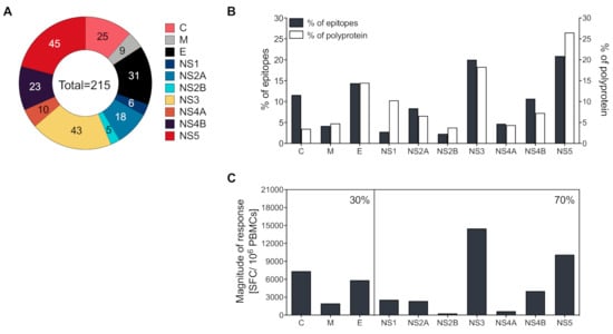 Epitopes were derived from all three structural proteins, as well as the seven non-structural proteins (NS1, NS2A, NS2B, NS3, NS4A, NS4B, and NS5). The structural proteins C and E, as well as the non-structural proteins NS3 and NS5, were the most dominantly targeted CD4 antigens and accounted for 25, 31, 43, and 45 of the 215 total epitopes, respectively (Figure 1A).