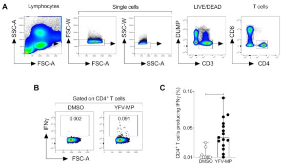 Validation of YVF-MP in vaccine individuals. (A) Representative dot plot of the gating strategy for CD4+ T cell selection. Lymphocytes were identified in forward scatter (FSC), and side scatter (SSC) plots. The doublets, CD14+, and CD19+ cells were excluded. Next, gated on CD3+ cells, the CD4+ and CD8+ population was selected. (B) Representative dot plot of gating strategy for antigen-specific CD4+ T cells producing IFNγ after DMSO or YFV-MP stimulation in the same donor. Fifteen samples from YF-17D vaccinees were used for YFV-MP validation. (C) Comparison of percentage of CD4+ T cells producing IFNγ between DMSO and YFV-MP stimulated cells. Data are expressed as the median and the range. Statistical analyses were performed using a two-tailed Wilcoxon test. p = 0.001.