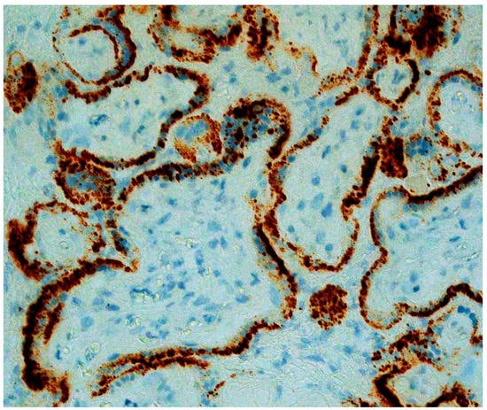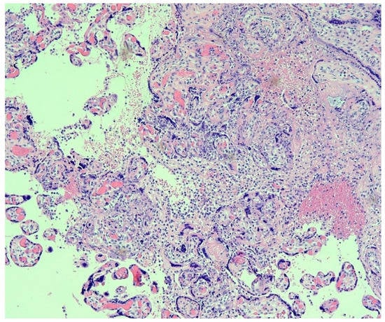 Pulinx and colleagues reported a 30-year-old pregnant woman in Belgium with dichorionic diamniotic twins at 22 weeks gestation who was diagnosed with mild symptomatic COVID-19 at the Emergency Department and discharged []. She returned 2 weeks later complaining of back and low abdominal pain, and no symptoms referable to her COVID-19 infection. She gave birth to two stillborn preterm fetuses. Maternal blood, amniotic fluid, and placental tissue samples all tested positive for SARS-CoV-2 using RT-PCR; samples of both amniotic sacs tested negative for the coronavirus. Microscopic examination of the twin placentas demonstrated chronic intervillositis composed of aggregated histiocytes and cytotoxic T lymphocytes in the intervillous space which were confirmed by immunohistochemistry for CD68, CD3, and CD8. There was also extensive intervillous fibrin deposition with necrosis of the surrounding villi. Positive staining of the syncytiotrophoblast cells was present as confirmed by immunohistochemistry using the SARS-CoV-2 antibody.
