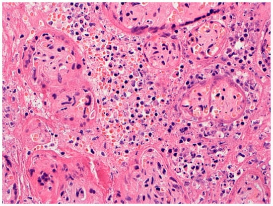 In Italy, Fachetti et al. screened placentas from 15 pregnant women with COVID-19 using immunohistochemistry for SARS-CoV-2 nucleocapsid antigen to identify infected placentas []. One placenta tested positive for the virus and underwent analysis in greater detail. It was from a 29-year-old woman hospitalized at 375 weeks gestation due to fever and worsening idiopathic thrombocytopenia. Vaginal delivery resulted in a healthy-appearing boy, but 24 h later he developed fever, breathing difficulty, vomiting, abdominal distension, hypotonia, and cutaneous mild erythema. He had radiological evidence of interstitial pneumonia and required intubation and mechanical ventilation. Just after birth his nasopharyngeal swab for SARS-CoV-2 by RT-PCR was inconclusive, but repeat testing at 36 and 72 h, and ultimately 17 days, following delivery was positive for the coronavirus. His condition improved and he was discharged on DOL 18. The placenta showed histiocytic-neutrophilic intervillositis (Figure 4). The chorionic villi that were involved by inflammation demonstrated thinning, discontinuity, and necrosis of the syncytiotrophoblast cell layer that was confirmed by immunohistochemistry for cytokeratin. There was evidence of fetal vascular malperfusion consisting of avascular and fibrotic villi and stroma-vascular karyorrhexis, and prominent perivillous fibrin deposition. Accelerated villous maturation and chorangiosis were also present. Immunohistochemistry revealed increased Hofbauer cells which expressed programmed death-ligand 1 (PD-L1). Scattered neutrophil extracellular traps (NETs) were identified by immunofluorescence. RNA in situ hybridization for SARS-CoV-2 demonstrated strong expression of viral RNA in the syncytiotrophoblast, as well as in scattered CD14+ intervillous mononuclear cells. Immunohistochemistry for SARS-CoV-2 spike and nucleocapsid proteins showed the syncytiotrophoblast to be positive for both proteins. Interestingly, the authors observed that anti-nucleocapsid staining was homogenously strong diffusely in the placental parenchyma, while immunoreactivity to the S-protein was variable but particularly strong in areas with abundant intervillous inflammation. Ultrastructural analysis demonstrated coronavirus-like particles present in chorionic villi within the cytoplasm of syncytiotrophoblast cells and also in the endothelium of fetal capillaries and fibroblasts. Particles consistent with the appearance of coronaviruses were seen within the cytoplasm of cells within the capillary lumina, which were likely monocytes.