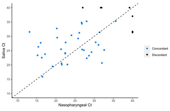 The sensitivity of NPS was 0.93 (95% CI 0.81–0.99) and that of saliva 0.91 (95% CI 0.79–0.98). The rRT-PCR cycle threshold results for concordantly positive NPS and saliva specimens were available for 33/39 pairs (Figure 1). Cycle threshold values obtained from saliva were higher than those from NPS (median difference in Ct 2.76; 95% CI 0.36–5.15, p = 0.03). The limit of detection for SARS-CoV-2 in saliva was 31.25 copies/mL using the Roche cobas SARS-CoV-2 assay.