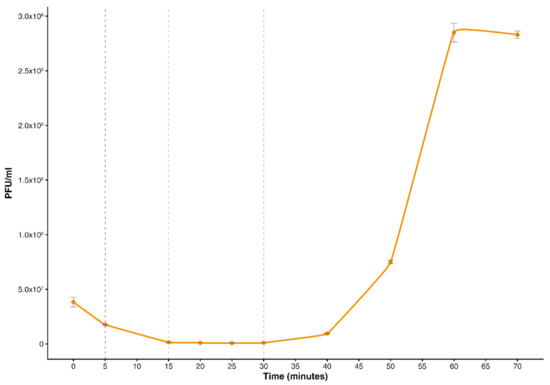 The one-step growth curve of vB_SauM-515A1 bacteriophage. Dotted lines indicate the three sampling time points selected for the transcriptomic analysis.