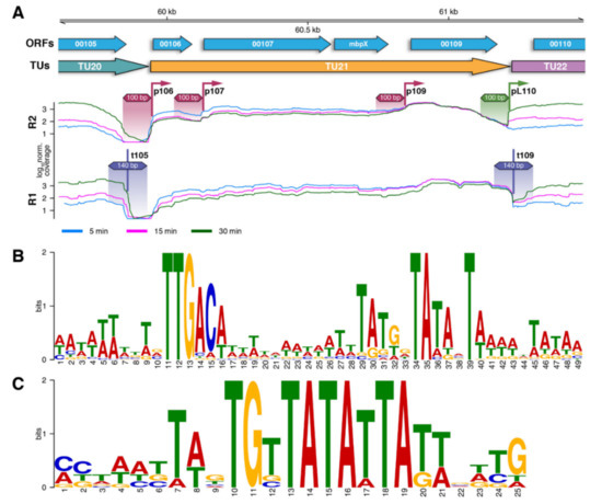 Our results demonstrated the presence of 35 independent TUs, where expression was regulated by two separate consensus sequences corresponding for early and late promoters (Figure 3).