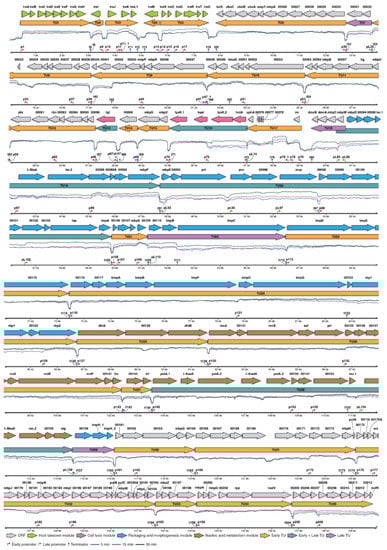To decipher the mechanism of the phage genes expression regulation more precisely, we searched for the active promoters and transcriptional terminators using RNA-seq data. Putative transcription start sites (TSSs) and transcriptional termination sites (TTSs) were identified by the sharp up- and down-steps of the coverage [39] (Figure 2).