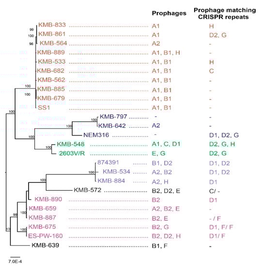 - Van Der Mee-Marquet, N.; Domelier, A.S.; Mereghetti, L.; Lanotte, P.; Rosenau, A.; Van Leeuwen, W.; Quentin, R. Prophagic DNA fragments in Streptococcus agalactiae strains and association with neonatal meningitis. J. Clin. Microbiol. 2006, 44, 1049–1058. [Google Scholar] [CrossRef][Green Version]