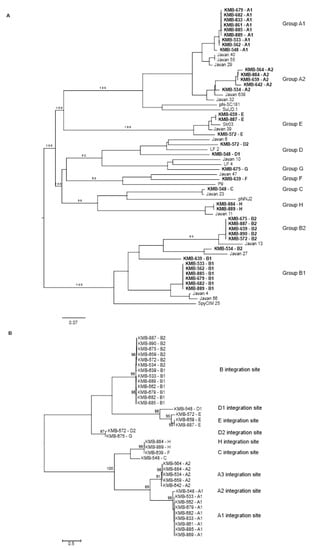 Phylogenetic tree of GBS prophages identified in the present study: (A) genome comparison at nucleotide level performed by the Genome BLAST Distance Phylogeny (GBDP) method using the formula D0 available at Victor web software []; (B) maximum likelihood tree comparing phage integrases at amino acid level in MEGAX using Jones–Taylor–Thornton (JTT) model [].