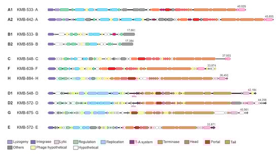 Genome maps of representative prophages belonging to A–H groups.
