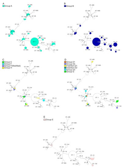 Distribution of prophage groups according to multi locus sequence typing (MLST) sequence types in 123 GBS strains: (A) group A; (B) group B; (C) related groups C, F and H; (D) related groups D and G; (E) group E.