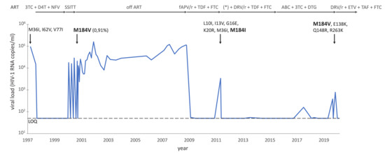 - Olearo, F.; Nguyen, H.; Bonnet, F.; Yerly, S.; Wandeler, G.; Stoeckle, M.; Cavassini, M.; Scherrer, A.; Costagiola, D.; Schmid, P.; et al. Impact of the M184V/I mutation on the efficacy of abacavir/lamivudine/dolutegravir therapy in HIV Treatment-experienced patients. Open Forum Infect. Dis. 2019, 6, ofz330. [Google Scholar] [CrossRef] [PubMed]