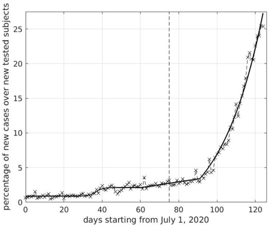 Percentage of SARS-Cov-2 positive cases over tested subjects in Italy versus number of days starting from July 1. The dashed vertical segment corresponds to schools re-opening on September 14. At about 14 days after school re-opening, linear growth is replaced by exponential. Data are made publicly available by Italian Civil Protection at https://github.com/pcm-dpc/COVID-19/tree/master/dati-regioni (accessed on 2 November 2020).