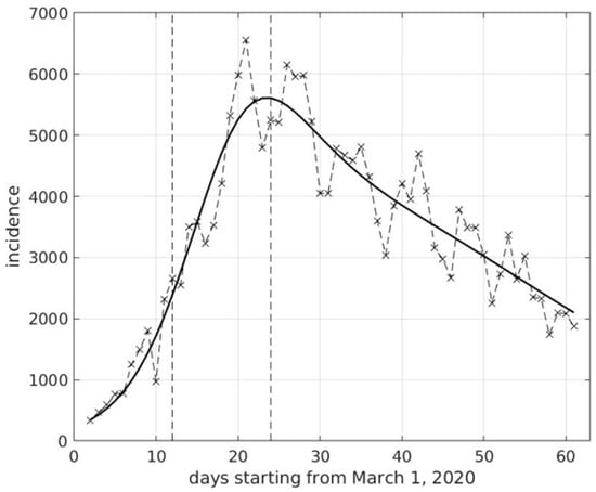 Temporal sequence of SARS-CoV-2 incidence (number of new positive cases per day) in Italy in the period March–April 2020. A fit with a generalization of the logistic model is superimposed to data. The first vertical dashed segment corresponds to March 12, the start of lockdown at national level, while the second one is the day of March 24, when the peak in the estimated incidence curve was reached.