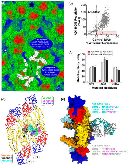 A road map was calculated showing the surface-exposed E protein residues and their interactions with ADI-Fab30056 (Figure 4a). The map shows that the epitopes near the inter-dimer interface are overlapping and have quasi-two-fold symmetry. Therefore, the bound Fab straddles both sides of the quasi-two-fold axis allowing only one Fab molecule to bind at a given time. Weak density was observed for Fabs bound at the 2f site because of icosahedral averaging of 3f-2f’, 3f’-2f and 3f-3f’ states, where 3f-3f’ is the predominant Fab bound state in the structure of ZIKV in complex with ADI-Fab30056 reported here (see Section 3.1). The quaternary epitope defined by the interface between and within both the dimers is required for the formation of a stable ZIKV-ADI-Fab30056 complex. Thus, the partial epitope at the 5f site consisting of only one half of the epitope (b-c and h-i loops) shows no bound Fab. A comparison of the interactions between the Fab at the 3f site and the Fab modelled at the 2f site shows a few missing interactions between the E proteins near the two-fold (E2-E2’) and the 2f Fab. This also explains the preference of the 3f site over the 2f site for Fab binding. Shotgun mutagenesis epitope mapping of ADI-30056 on a ZIKV prM/E alanine scan mutation library (see Methods) and binding assays using flow cytometry identified three alanine mutations, D67A, Q89A and K118A, that each reduced ADI-Fab30056 binding (Figure 4b,c). Consistent with this, the structure showed that these E protein residues (all on a single E monomer, E5) interact with both Fab-VH-CDR2 and Fab-VH-CDR3 loops and, therefore, stabilize the ZIKV-ADI-Fab30056 complex (Figure 4). Several geographically distributed ZIKV strains were efficiently neutralized by ADI-30056, therefore providing broad range protection against different strains of ZIKV (Figure S4).