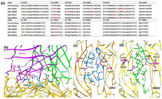 Monoclonal antibodies ADI-30056 and ZIKV-117 have comparable binding affinities and bind similar regions on ZIKV. The epitope targeted by ZIKV-117 was isolated from donors in Haiti, Brazil and Mexico, whereas ADI-30056 was isolated from donors in Colombia. The relative immuno-dominance of the epitope defined by ADI-30056 in multiple donors is most likely to be due to an abundance of these types of antibodies in the germline (native) repertoire. In the current study, the serum samples were collected from ZIKV infected donors with a pre-existing DENV infection []. Five months’ post-infection with ZIKV, these donors developed highly potent ZIKV specific antibodies. More than 50% of these ZIKV-specific antibodies had overlapping epitopes with ADI-30056. These nAbs displayed similar neutralization and binding affinities and also utilized the same germline sequence (Figure 5a). The four most potent antibodies from the ZIKV-specific antibody pool (ADI-29997, ADI-30000, ADI30031, ADI-30056 with IC50 values of 14.98, 7.71, 5.18 and 1.78 ng/mL, respectively) were compared to gain insights into the structural basis of Ab affinity maturation. Multiple sequence alignments and structure comparisons suggested converged somatic mutations of the heavy chain VH-CDR loop residues N31, R56, N57, Y59 and VL-CDR residue E27 to be critical for binding the E protein residues of the h-i and b-c loops at the inter-dimer interface (Figure 5c; Table S2). Minor sequence differences in the CDR-loop residues are reflected in their binding affinities. For example, the VH-CDR2 loop of ADI-29997 has the residues KHT instead of R/NNK as in ADI-30000, ADI-30031, and ADI-30056, and has lower affinity to ZIKV when compared to other antibodies in this pool. Precise tailoring of the CDR-loop residues from the ZIKV-specific antibody pool by somatic hypermutation improved the paratope complementarity to the ZIKV quaternary epitope, which is in line with the evolution of ZIKV nAb molecules with higher binding affinities. Structure comparisons and sequence alignments of ZIKV and DENV strains at the inter-dimer interface show major epitope differences between the two viruses (Figure 5c,d). The most striking difference is the glycosylation of the ZIKV D67 equivalent residue, N67 in DENV. The glycosylation of N67 sterically hinders nAb access to the inter-dimer interface among the four serotypes of DENV. Therefore, an antibody similar to ADI-30056 or ZIKV-117 that locks the inter-dimer interface has not been so far observed in DENV.