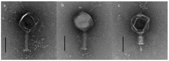 Transmission electron micrographs of Erwinia phages pEa_SNUABM_12 (a), pEa_SNUABM_47 (b), pEa_SNUABM_50 (c); the microscope was operated at 120kV. Scale bar: 100nm.
