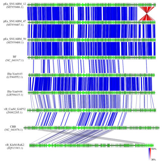 Comparative genome analysis with RaK2-like phages showed that the genome of pEa_SNUABM_12 was arranged in opposite orientation (red) at the last region of their genome compared with the other two phages (pEa_SNUABM_47 and pEa_SNUABM_50) isolated in this study. The blue shades indicate normal orientation. They showed high sequence similarity with Serratia phage BF (Figure 2).