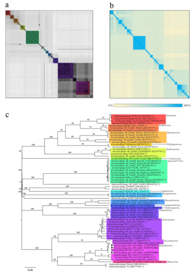 Whole genome phylogenetic analysis of Myoviridae jumbo phages infecting Enterobacterales. Dot plot (a) and average nucleotide identity (ANI) heat map (b) of 65 jumbo phages with genomes over 200 kb. The ANI value can be found in Table S4. The phylogenetic tree was created from VICTOR with default settings for prokaryotic viruses (c). The phages isolated in this study were indicated with black arrow (▶). Seoulvirus is marked with red box, Erskinevirus with orange box, Machinavirus with light orange box, Wellingtonvirus with yellow box, Derbicusvirus with yellowish green box, Goslarvirus with green box, Agrican357virus with emerald box, Iapetusvirus with light blue box, Risingsunvirus with sky-blue box, Alexandravirus with blue box, Sasquantchvirus with deep blue box, Yoloswagvirus with dark blue box, Salmondvirus with violet box, Asteriusvirus with purple box, Alcyoneusvirus with orchid pink box, Eneladusvirus with pink box, and Mimasvirus with dark pink box (a,c).