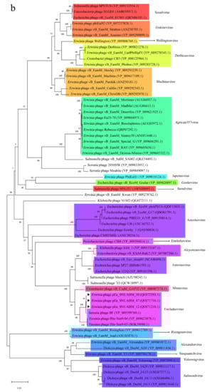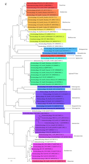 - Thompson, D.W.; Casjens, S.R.; Sharma, R.; Grose, J.H. Genomic comparison of 60 completely sequenced bacteriophages that infect Erwinia and/or Pantoea bacteria. Virology 2019, 535, 59–73. [Google Scholar] [CrossRef] [PubMed]