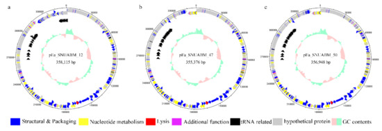 Whole genome map of Erwinia phages (a) pEa_SNUABM_12; (b) pEa_SNUABM_47; and (c) pEa_SNUABM_50. Predicted ORFs were functionally categorized and colored; Blue represents proteins with structural and packaging functions, yellow represents proteins with nucleotide metabolism functions, red represents lysis functions, purple represents proteins with additional functions, black represents tRNAs or tRNA related functions, and gray represents proteins with hypothetical functions. Scale = base pair.
