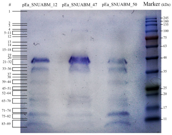 Protein analysis of phages pEa_SNUABM_12, pEa_SNUABM_47, and pEa_SNUABM_50. The number on the left side indicates the proteins identified by mass spectrometry and match with the number in the Table S5.