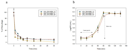 Adsorption (a) and one-step growth curve (b) of pEa_SNUABM_12, pEa_SNUABM_47, and pEa_SNUABM_50.