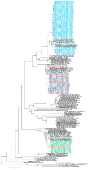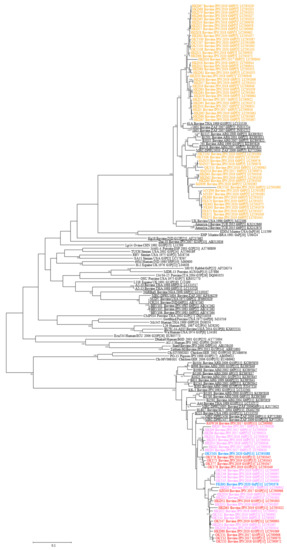 - Kumar, S.; Stecher, G.; Li, M.; Knyaz, C.; Tamura, K. MEGA X: Molecular evolutionary genetics analysis across computing platforms. Mol. Biol. Evol. 2018, 35, 1547–1549. [Google Scholar] [CrossRef]