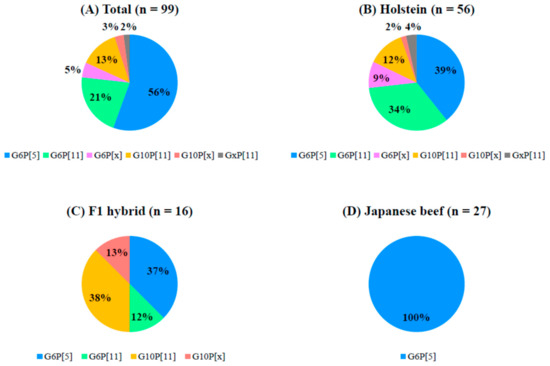 Frequency (in percent) of the occurrence of G and P genotypes of bovine rotaviruses A in each cattle type. (A) Total, (B) Holstein calves, (C) F1 hybrids, and (D) Japanese beef calves. Different combinations of G and P genotypes are shown in different colors.