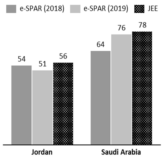 Despite these powers, ensuring the compliance of member states with the IHR remains a difficult task for the WHO, and a wide variation in levels of IHR compliance exists between member states [186]. Using the indices developed by Kandel et al. (2020), the operational readiness capacities for Jordan and Saudi Arabia were investigated [186]. As illustrated in Figure 2, there is some discrepancy between the scores given by the WHO in their Joint External Evaluation (JEE) mission reports and those self-reported via the Electronic State Parties Self-Assessment Annual Reporting Tool (e-SPAR). The JEE is carried out by a WHO mission, while the e-SPAR scores are assessed by the country itself. The low self-assessment score could be due to a lack of full understanding of capacity indicators and scores. The JEE mission report was undertaken in 2016 for Jordan (https://www.who.int/ihr/publications/WHO-WHE-CPI-2017.1/en/) and in 2017 for Saudi Arabia (https://www.who.int/ihr/publications/WHO-WHE-CPI-2017.25.report/en/). Saudi Arabia was given a score of 78 by the JEE mission in 2017, but it gave itself scores of 64 in 2018 and 76 in 2019. It is worth noting that the e-SPAR assessments are self-reported and not independently verified by the WHO. Taking a closer look at the capacity indices (Table 2), several of Jordan’s capacities are ranked at 3 due to poor decentralization, with capacities at the governorate and district levels in need of consolidation. In contrast, Saudi Arabia’s capacities are scored at 4, indicating a functional capability at both the national and sub-national levels [186].