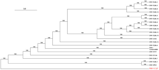 Maximum likelihood tree of all analyzed CHV-1 isolates with an FHV-1 C-27 outgroup (in red). Branch labels represent bootstrap support. Note the separation of two CHV-1 isolates (ELAL-1 and BTU-1) from the remaining CHV-1 isolates. CHV-1 ELAL-1 was obtained from a host animal in Texas in 2019 and BTU-1 was obtained from a host animal in Brazil in 2012.