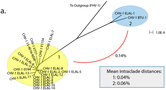 (a) Phylogenetic network of all analyzed CHV-1 isolates with a FHV-1 (C-27) outgroup. Two distinct clades are visible: 1 (yellow) and 2 (blue). The interclade distance (0.14%) is illustrated with a red line and was calculated using an alignment of consensus sequences (MAFFT ver. 7.450) from each clade. The mean intraclade distances were calculated using MEGAX. (b) Detail of subsection of clade 1 from Figure 2a. All isolates shown in this subsection were obtained from the same outbreak of CHV-1 in New York State in 2008. As expected, the genomes of these particular CHV-1 isolates are extremely homogenous.