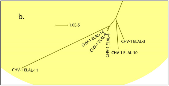 The same tree file was also visualized using Splitstree ver 4.16.1 [28] (Figure 2) to further elucidate clade structure. Two clades were visualized. Clade 2 contained two isolates: ELAL-1 (a CHV-1 isolate collected from a host in 2019 in San Antonio, TX, USA) and BTU-1 (a CHV-1 isolate collected from a host in 2012 in Brazil). Clade 1 contained 18 isolates, most of which originated from host animals in the USA. Clade 1 also contained previously sequenced isolates from the UK [18] and Australia [19]. As expected, isolates obtained from multiple host animals in the same colony during an outbreak (ELAL-3, ELAL-4, ELAL-9, ELAL-10, ELAL-11, ELAL-14) were extremely homogenous and were grouped closely together (Figure 2b).