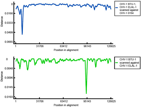 Regions of genomic distance between 3 CHV-1 isolates (0194, ELAL-1 and BTU-1) were visualized using RDP ver 4.100 [24] using the manual distance plot function (window = 1200, step = 500, transition:transversion rate ratio = 2, coefficient of variation = 1, Jin and Nei model [25]).