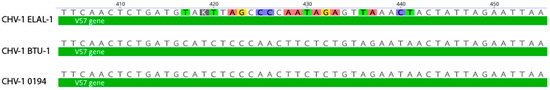 Variant in CHV-1 ELAL-1 isolate in the V57 gene region. A clearly identifiable region of low identity was detected centered around position 430 in the V57 gene which corresponded to a novel variant in CHV-1 ELAL-1.
